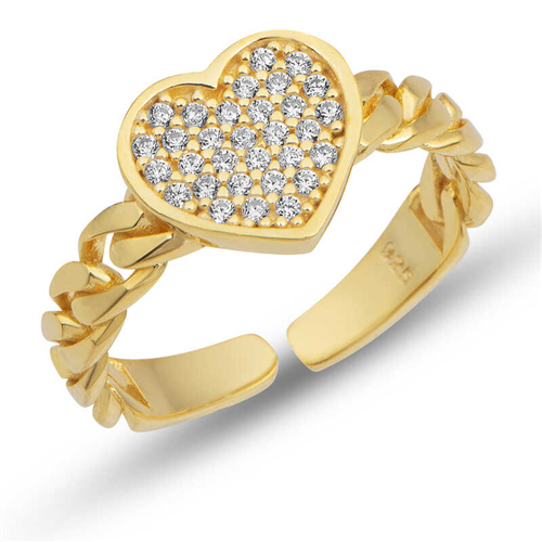 Silver Adjustable Gold Heart Women's RingThe heart symbol has always been the symbol of unconditional love and passion. In religious teachings, the power of the heart is limitless. Because the heart is the house of the Creator and our gateway to reality that opens to the universe. This stylish silver heart ring is a perfect option for a birthday gift, Valentine's Day gift or a gift for mothers on special occasions. The silver gold heart women's ring is made of 925 sterling silver. This ring is gold-plated. Gold-plated silver women's ring models preserve their shine for a long time. The stones on it are zircon. As with all our silver women's ring models, the silver adjustable gold heart women's ring model is also handmade. Due to silver and precious stones, there may be a ± 10% deviation in the average product weight. Width: 2.10 cmLength: 2.10 cmAvg. Weight: 2.40 gr.