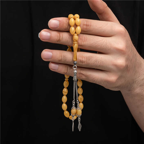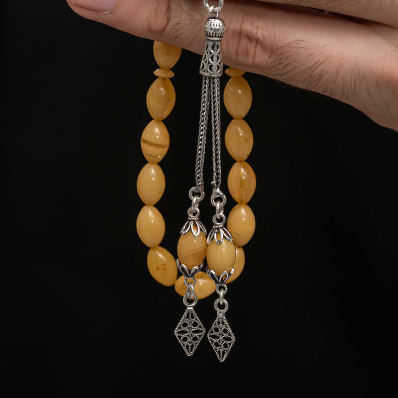 Silver Tassel Pressed Amber Prayer Beads Amber is a substance formed by the accumulation of pine tree resin underground over many years. It is almost the same hardness as stone, but its density is lower. It emits a pine scent. It is a valuable substance because its formation takes a long time and cannot be made artificially. Pressed amber, on the other hand, is a material that bears the characteristics of amber, resembles it in appearance but is not real. Various materials have been produced from amber in our country and in many parts of the world. Prayer beads are the most commonly produced in our country. Amber prayer beads give off an amber-like scent and change color as they are warmed in the hand. They come in many colors. There are even amber prayer beads that are a combination of two colors. They are usually used with a silver tassel or can be used systematically. Our country's distinguished rosary masters frequently craft this material, creating various works of art. These rosaries are also bought and sold by collectors. The pressed amber rosary with silver tassels is a very elegant type of rosary that can be used in everyday life. A must-have gift for special occasions, pressed amber rosaries are a great choice for men on special occasions like birthdays, Valentine's Day, and Father's Day. The silver tasseled squeezed amber prayer beads model is manufactured entirely by hand, as are other amber prayer beads models. Note: Different models of prayer beads' silver tassel ends are sent. Bead Width: 0.80 cm Bead Length: 1.00 cm Prayer Length: 32 cm Average Weight: 17.50 gr