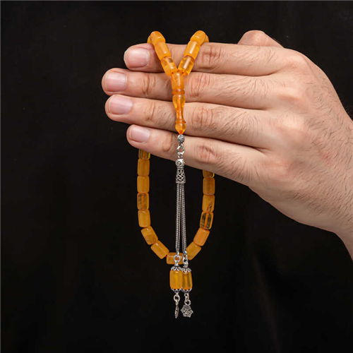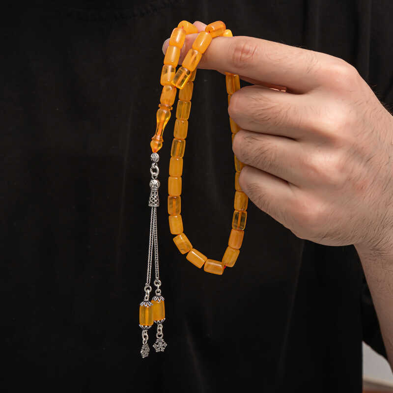 Silver Tassel Pressed Amber Prayer Beads Amber is a substance formed by the accumulation of pine tree resin underground over many years. It is almost the same hardness as stone, but its density is lower. It emits a pine scent. It is a valuable substance because its formation takes a long time and cannot be made artificially. Pressed amber, on the other hand, is a material that bears the characteristics of amber, resembles it in appearance but is not real. Various materials have been produced from amber in our country and in many parts of the world. Prayer beads are the most commonly produced in our country. Amber prayer beads give off an amber-like scent and change color as they are warmed in the hand. They come in many colors. There are even amber prayer beads that are a combination of two colors. They are usually used with a silver tassel or can be used systematically. Our country's distinguished rosary masters frequently craft this material, creating various works of art. These rosaries are also bought and sold by collectors. The pressed amber rosary with silver tassels is a very elegant type of rosary that can be used in everyday life. A must-have gift for special occasions, pressed amber rosaries are a great choice for men on special occasions like birthdays, Valentine's Day, and Father's Day. The silver tasseled squeezed amber prayer beads model is manufactured entirely by hand, as are other amber prayer beads models. Note: Different models of prayer beads' silver tassel ends are sent. Bead Width: 0.80 cm Bead Length: 1.00 cm Prayer Length: 32 cm Average Weight: 22.60 gr