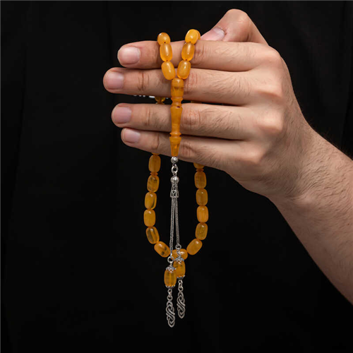 Silver Tassel Pressed Amber Prayer Beads Amber is a substance formed by the accumulation of pine tree resin underground over many years. It is almost the same hardness as stone, but its density is lower. It emits a pine scent. It is a valuable substance because its formation takes a long time and cannot be made artificially. Pressed amber, on the other hand, is a material that bears the characteristics of amber, resembles it in appearance but is not real. Various materials have been produced from amber in our country and in many parts of the world. Prayer beads are the most commonly produced in our country. Amber prayer beads give off an amber-like scent and change color as they are warmed in the hand. They come in many colors. There are even amber prayer beads that are a combination of two colors. They are usually used with a silver tassel or can be used systematically. Our country's distinguished rosary masters frequently craft this material, creating various works of art. These rosaries are also bought and sold by collectors. The pressed amber rosary with silver tassels is a very elegant type of rosary that can be used in everyday life. A must-have gift for special occasions, pressed amber rosaries are a great choice for men on special occasions like birthdays, Valentine's Day, and Father's Day. The silver tasseled squeezed amber prayer beads model is manufactured entirely by hand, as are other amber prayer beads models. Note: Different models of prayer beads' silver tassel ends are sent. Bead Width: 0.90 cm Bead Length: 1.10 cm Prayer Length: 36 cm Average Weight: 25.70 gr