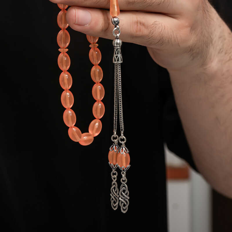 Silver Tassel Pressed Amber Prayer Beads Amber is a substance formed by the accumulation of pine tree resin underground over many years. It is almost the same hardness as stone, but its density is lower. It emits a pine scent. It is a valuable substance because its formation takes a long time and cannot be made artificially. Pressed amber, on the other hand, is a material that bears the characteristics of amber, resembles it in appearance but is not real. Various materials have been produced from amber in our country and in many parts of the world. Prayer beads are the most commonly produced in our country. Amber prayer beads give off an amber-like scent and change color as they are warmed in the hand. They come in many colors. There are even amber prayer beads that are a combination of two colors. They are usually used with a silver tassel or can be used systematically. Our country's distinguished rosary masters frequently craft this material, creating various works of art. These rosaries are also bought and sold by collectors. The pressed amber rosary with silver tassels is a very elegant type of rosary that can be used in everyday life. A must-have gift for special occasions, pressed amber rosaries are a great choice for men on special occasions like birthdays, Valentine's Day, and Father's Day. The silver tasseled squeezed amber prayer beads model is manufactured entirely by hand, as are other amber prayer beads models. Note: Different models of prayer beads' silver tassel ends are sent. Bead Width: 0.80 cm Bead Length: 1.00 cm Prayer Length: 32 cm Average Weight: 19.60 gr