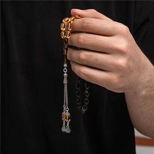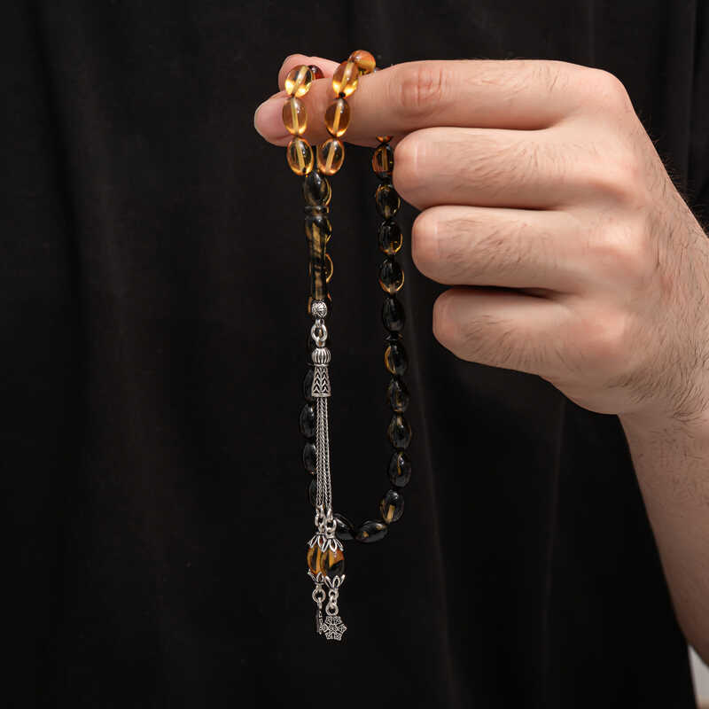 Silver Tassel Pressed Amber Prayer Beads Amber is a substance formed by the accumulation of pine tree resin underground over many years. It is almost the same hardness as stone, but its density is lower. It emits a pine scent. It is a valuable substance because its formation takes a long time and cannot be made artificially. Pressed amber, on the other hand, is a material that bears the characteristics of amber, resembles it in appearance but is not real. Various materials have been produced from amber in our country and in many parts of the world. Prayer beads are the most commonly produced in our country. Amber prayer beads give off an amber-like scent and change color as they are warmed in the hand. They come in many colors. There are even amber prayer beads that are a combination of two colors. They are usually used with a silver tassel or can be used systematically. Our country's distinguished rosary masters frequently craft this material, creating various works of art. These rosaries are also bought and sold by collectors. The pressed amber rosary with silver tassels is a very elegant type of rosary that can be used in everyday life. A must-have gift for special occasions, pressed amber rosaries are a great choice for men on special occasions like birthdays, Valentine's Day, and Father's Day. The silver tasseled squeezed amber prayer beads model is manufactured entirely by hand, as are other amber prayer beads models. Note: Different models of prayer beads' silver tassel ends are sent. Bead Width: 0.80 cm Bead Length: 1.00 cm Prayer Length: 32 cm Average Weight: 17.20 gr