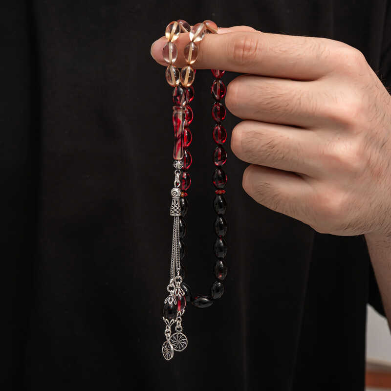 ​Silver Tassel Pressed Amber Prayer Beads Amber is a substance formed by the accumulation of pine tree resin underground over many years. It is almost the same hardness as stone, but its density is lower. It emits a pine scent. It is a valuable substance because its formation takes a long time and cannot be made artificially. Pressed amber, on the other hand, is a material that bears the characteristics of amber, resembles it in appearance but is not real. Various materials have been produced from amber in our country and in many parts of the world. Prayer beads are the most commonly produced in our country. Amber prayer beads give off an amber-like scent and change color as they are warmed in the hand. They come in many colors. There are even amber prayer beads that are a combination of two colors. They are usually used with a silver tassel or can be used systematically. Our country's distinguished rosary masters frequently craft this material, creating various works of art. These rosaries are also bought and sold by collectors. The pressed amber rosary with silver tassels is a very elegant type of rosary that can be used in everyday life. A must-have gift for special occasions, pressed amber rosaries are a great choice for men on special occasions like birthdays, Valentine's Day, and Father's Day. The silver tasseled squeezed amber prayer beads model is manufactured entirely by hand, as are other amber prayer beads models. Note: Different models of prayer beads' silver tassel ends are sent. Bead Width: 0.80 cm Bead Length: 1.00 cm Prayer Length: 32 cm Average Weight: 18.30 gr