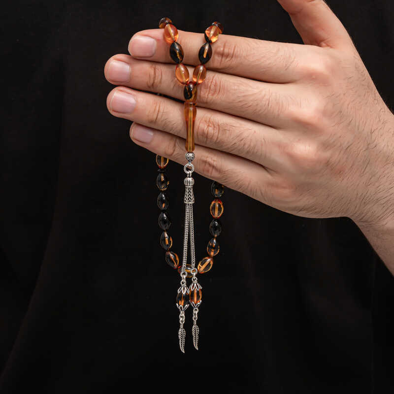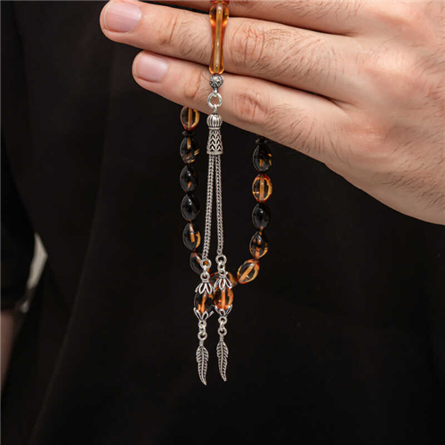 Silver Tassel Pressed Amber Prayer Beads Amber is a substance formed by the accumulation of pine tree resin underground over many years. It is almost the same hardness as stone, but its density is lower. It emits a pine scent. It is a valuable substance because its formation takes a long time and cannot be made artificially. Pressed amber, on the other hand, is a material that bears the characteristics of amber, resembles it in appearance but is not real. Various materials have been produced from amber in our country and in many parts of the world. Prayer beads are the most commonly produced in our country. Amber prayer beads give off an amber-like scent and change color as they are warmed in the hand. They come in many colors. There are even amber prayer beads that are a combination of two colors. They are usually used with a silver tassel or can be used systematically. Our country's distinguished rosary masters frequently craft this material, creating various works of art. These rosaries are also bought and sold by collectors. The pressed amber rosary with silver tassels is a very elegant type of rosary that can be used in everyday life. A must-have gift for special occasions, pressed amber rosaries are a great choice for men on special occasions like birthdays, Valentine's Day, and Father's Day. The silver tasseled squeezed amber prayer beads model is manufactured entirely by hand, as are other amber prayer beads models. Note: Different models of prayer beads' silver tassel ends are sent. Bead Width: 0.80 cm Bead Length: 1.00 cm Prayer Length: 32 cm Average Weight: 17 gr