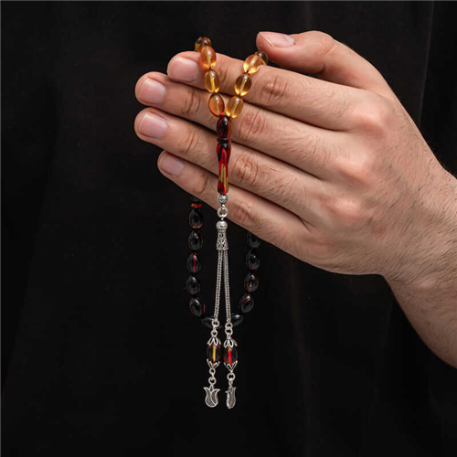 Silver Tassel Pressed Amber Prayer Beads Amber is a substance formed by the accumulation of pine tree resin underground over many years. It is almost the same hardness as stone, but its density is lower. It emits a pine scent. It is a valuable substance because its formation takes a long time and cannot be made artificially. Pressed amber, on the other hand, is a material that bears the characteristics of amber, resembles it in appearance but is not real. Various materials have been produced from amber in our country and in many parts of the world. Prayer beads are the most commonly produced in our country. Amber prayer beads give off an amber-like scent and change color as they are warmed in the hand. They come in many colors. There are even amber prayer beads that are a combination of two colors. They are usually used with a silver tassel or can be used systematically. Our country's distinguished rosary masters frequently craft this material, creating various works of art. These rosaries are also bought and sold by collectors. The pressed amber rosary with silver tassels is a very elegant type of rosary that can be used in everyday life. A must-have gift for special occasions, pressed amber rosaries are a great choice for men on special occasions like birthdays, Valentine's Day, and Father's Day. The silver tasseled squeezed amber prayer beads model is manufactured entirely by hand, as are other amber prayer beads models. Note: Different models of prayer beads' silver tassel ends are sent. Bead Width: 0.80 cm Bead Length: 1.00 cm Prayer Length: 32 cm Average Weight: 18.80 gr