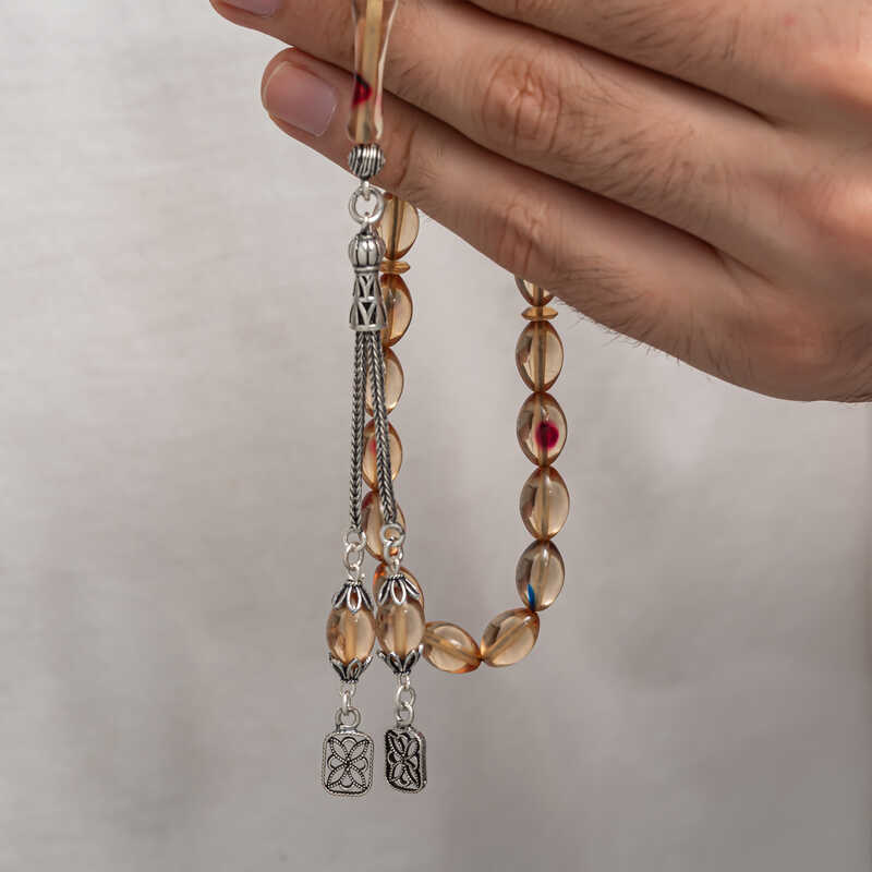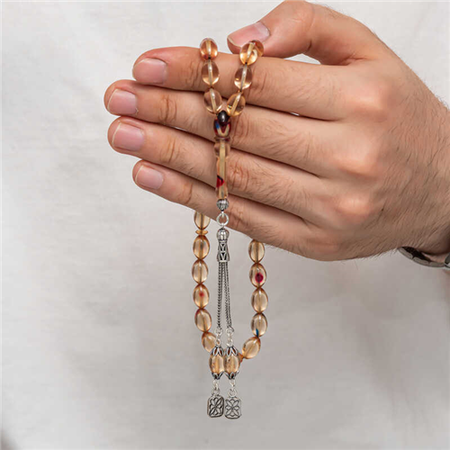 Silver Tassel Pressed Amber Prayer Beads Amber is a substance formed by the accumulation of pine tree resin underground over many years. It is almost the same hardness as stone, but its density is lower. It emits a pine scent. It is a valuable substance because its formation takes a long time and cannot be made artificially. Pressed amber, on the other hand, is a material that bears the characteristics of amber, resembles it in appearance but is not real. Various materials have been produced from amber in our country and in many parts of the world. Prayer beads are the most commonly produced in our country. Amber prayer beads give off an amber-like scent and change color as they are warmed in the hand. They come in many colors. There are even amber prayer beads that are a combination of two colors. They are usually used with a silver tassel or can be used systematically. Our country's distinguished rosary masters frequently craft this material, creating various works of art. These rosaries are also bought and sold by collectors. The pressed amber rosary with silver tassels is a very elegant type of rosary that can be used in everyday life. A must-have gift for special occasions, pressed amber rosaries are a great choice for men on special occasions like birthdays, Valentine's Day, and Father's Day. The silver tasseled squeezed amber prayer beads model is manufactured entirely by hand, as are other amber prayer beads models. Note: Different models of prayer beads' silver tassel ends are sent. Bead Width: 0.80 cm Bead Length: 1 cm Prayer Length: 30 cm Average Weight: 18 gr