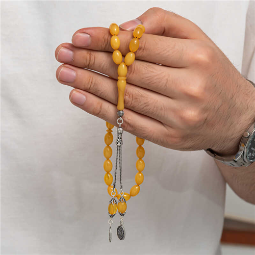Silver Tassel Pressed Amber Prayer Beads Amber is a substance formed by the accumulation of pine tree resin underground over many years. It is almost the same hardness as stone, but its density is lower. It emits a pine scent. It is a valuable substance because its formation takes a long time and cannot be made artificially. Pressed amber, on the other hand, is a material that bears the characteristics of amber, resembles it in appearance but is not real. Various materials have been produced from amber in our country and in many parts of the world. Prayer beads are the most commonly produced in our country. Amber prayer beads give off an amber-like scent and change color as they are warmed in the hand. They come in many colors. There are even amber prayer beads that are a combination of two colors. They are usually used with a silver tassel or can be used systematically. Our country's distinguished rosary masters frequently craft this material, creating various works of art. These rosaries are also bought and sold by collectors. The pressed amber rosary with silver tassels is a very elegant type of rosary that can be used in everyday life. A must-have gift for special occasions, pressed amber rosaries are a great choice for men on special occasions like birthdays, Valentine's Day, and Father's Day. The silver tasseled squeezed amber prayer beads model is manufactured entirely by hand, as are other amber prayer beads models. Note: Different models of prayer beads' silver tassel ends are sent. Bead Width: 0.80 cm Bead Length: 1 cm Prayer Length: 30 cm Average Weight: 18.00 gr