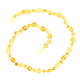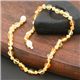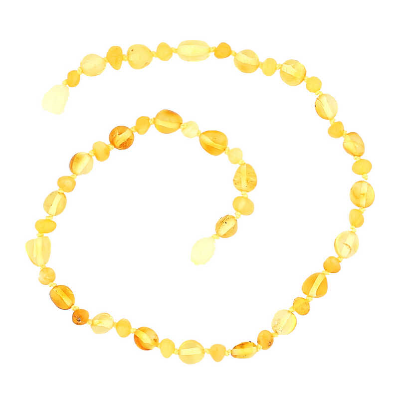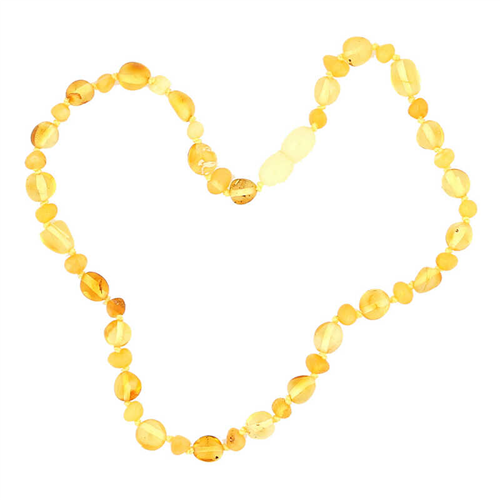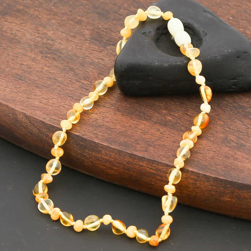 Baby Drop Amber Teething Necklace Amber teething necklaces are used in babies on average from the 4th month onwards. They help children go through the teething period more comfortably for complaints related to the teething period such as discharge from the mouth, pain, loss of appetite, and insomnia. It works through skin contact and skin warmth. Amber necklaces have a localized effect. They are made of silk thread and each bead is individually knotted. There is a hidden plastic screw clasp on the back of the amber necklaces. It takes between 24 and 72 hours for amber to show its effect, depending on the person's body and growth spurt. Amber shows its effect as it is used and in contact with the skin. The average standard size suitable for babies between the ages of 0-3 is 32cm-34cm. Necklaces are among the most popular ornaments for everyone, we think this interest in ornaments starts at a young age. We offer ornate and stylish jewelry models that spark an interest in adornment from a young age. Little ones who don't compromise on the elegance of amber will love using it as an accessory. All of our products are handmade, and due to the presence of precious stones, there may be a ±10% deviation in product weight. Length: 34 cm Bead Size: 0.70 cm Weight: 5.3 gr