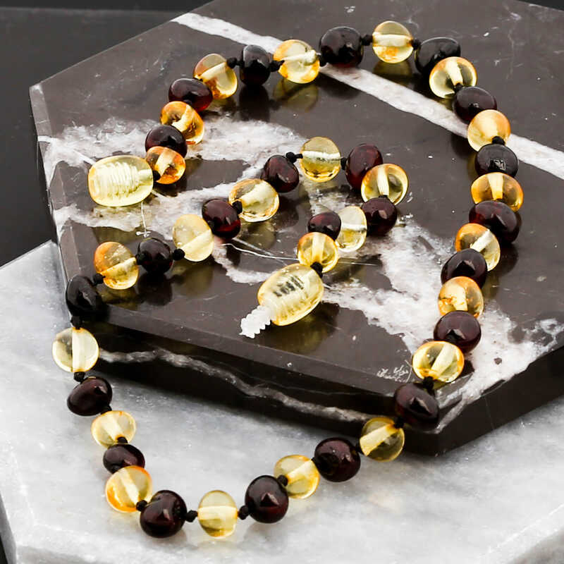 Baby Drop Amber Teething Necklace: Amber teething necklaces are typically worn by babies starting around the fourth month. They help children navigate the teething period more comfortably, especially when experiencing symptoms related to teething, such as drooling, pain, loss of appetite, and insomnia. They work through skin contact and skin warmth. Amber necklaces have a localized effect. They are made of silk thread, with individual knots between each bead. Amber necklaces have a hidden plastic screw clasp at the back. Amber takes between 24 and 72 hours to take effect, depending on the individual's body and growth spurt. Amber improves with use and skin contact. The average standard size for babies aged 0-3 is 32cm-34cm. Necklaces are among the most popular adornments for everyone, and we believe this fascination with adornment begins at a young age. We offer a variety of ornate and stylish jewelry styles that spark an interest in adornment at a young age. Amber will be an accessory that little ones who don't compromise on elegance will love to wear. All of our products are handmade, and due to the presence of precious stones, there may be a ± 10% deviation in product weight. Length: 34 cm Grain Size: 0.60 cm Weight: 6.3 g