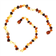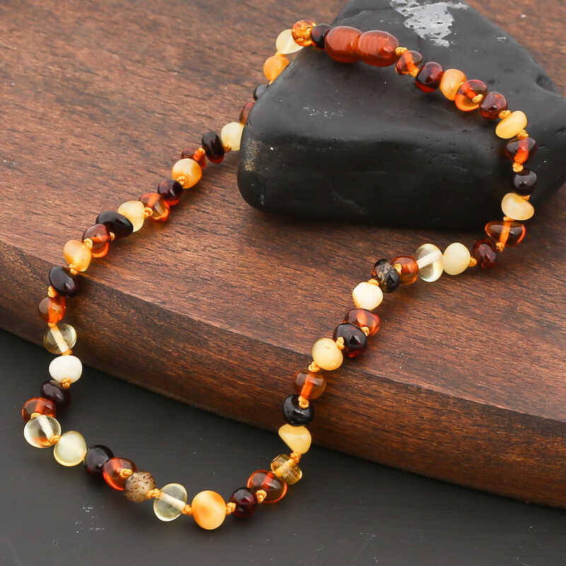 Baby Drop Amber Teething Necklace: Amber teething necklaces are typically worn by babies starting around the fourth month. They help children navigate the teething period more comfortably, especially when experiencing symptoms related to teething, such as drooling, pain, loss of appetite, and insomnia. They work through skin contact and skin warmth. Amber necklaces have a localized effect. They are made of silk thread, with individual knots between each bead. Amber necklaces have a hidden plastic screw clasp at the back. Amber takes between 24 and 72 hours to take effect, depending on the individual's body and growth spurt. Amber improves with use and skin contact. The average standard size for babies aged 0-3 is 32cm-34cm. Necklaces are among the most popular adornments for everyone, and we believe this fascination with adornment begins at a young age. We offer a variety of ornate and stylish jewelry styles that spark an interest in adornment at a young age. Amber will be an accessory that little ones who don't compromise on elegance will love to wear. All of our products are handmade, and due to the presence of precious stones, there may be a ±10% deviation in product weight. Length: 34 cm Grain Size: 0.50 cm Weight: 5.3 g