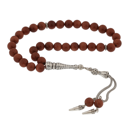 Brown Star Stone Prayer Beads with Metal Tassels Star Stone is known as the stone of determination. It is associated with increasing the determination and self-confidence necessary to realize all your dreams. Its sparkling inner sparks bring a glimmer of hope and joy when you are feeling pessimistic and indecisive. These celestial sparks remind us that light can always be found in darkness. Known as the stone of luck and love, it is believed to pave the way for a person in this regard. It dispels negative energy and allows for positive energy to come in. It creates a more energetic and happy start to the day. This precious stone is a perfect choice for birthday gifts, Father's Day, or special occasions. The prayer beads are handmade. Due to the silver and precious stones, there may be a ±10% deviation in the stated product weight. Length: 25.00 cm Grain Size: 0.70 cm Average Weight: 30 gr