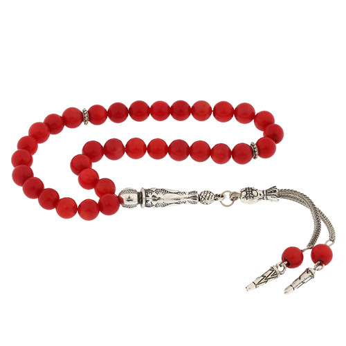 Natural Stone Metal Tassel Coral Stone Prayer Beads Coral stone is a natural stone that occurs naturally in nature. Its healing properties and therapeutic properties have been confirmed by users. Coral is used for its healing properties. This stone is also used as an ornament. Coral stone is used in various bracelets, necklaces, rings, and other jewelry. This precious stone is a perfect choice for birthday gifts, Father's Day, or special occasions. The prayer beads are handmade. Due to the silver and precious stones, there may be a ±10% deviation in the stated product weight. Length: 25.00 cm Grain Size: 0.80 cm Average Weight: 35 gr