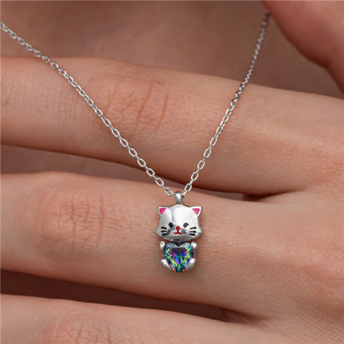 Silver Mystic Topaz Stone Cute Cat Necklace Cats are known for their independence. For this reason, cat necklaces symbolize free spirits and emphasize the self-confidence of the wearer. Cats, the cute source of joy in our homes, are the symbol of innocence as well as being clean. They have a noble and logical personality, excellent intuition and rational sensitivity. This stylish necklace is a perfect option for a birthday gift, Valentine's Day or special occasions. The necklace is made of 925 sterling silver. Rhodium plated on the silver. Due to silver and precious stones, there may be ± 10% deviation from the average product weight. Width: 0.80 cm Length: 1.00 cm Avg. Weight: 2.30 gr. Chain Length: 45.00 cm