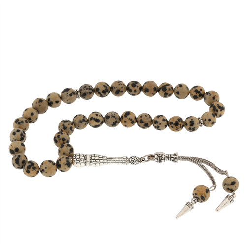 Natural Stone Dalmatian Jasper Prayer Beads with Metal Tassels Named after Dalmatian dogs, this stone appears with black dots on a white background, just like Dalmatian dogs. This stone helps you break down obstacles and relieves you of insecurity. This precious stone is an excellent choice for birthday gifts, Father's Day, or special occasions. Like many natural stones, jasper stones directly or indirectly benefit human health. They prevent anger and anxiety disorders, making people feel much happier and more serene. Thanks to the energy they emit, they reduce symptoms of depression by half. This prayer bead is handmade. Due to the silver and precious stones, there may be a ±10% deviation in the stated product weight. Length: 23.00 cm Grain Size: 0.70 cm Average Weight: 30 g