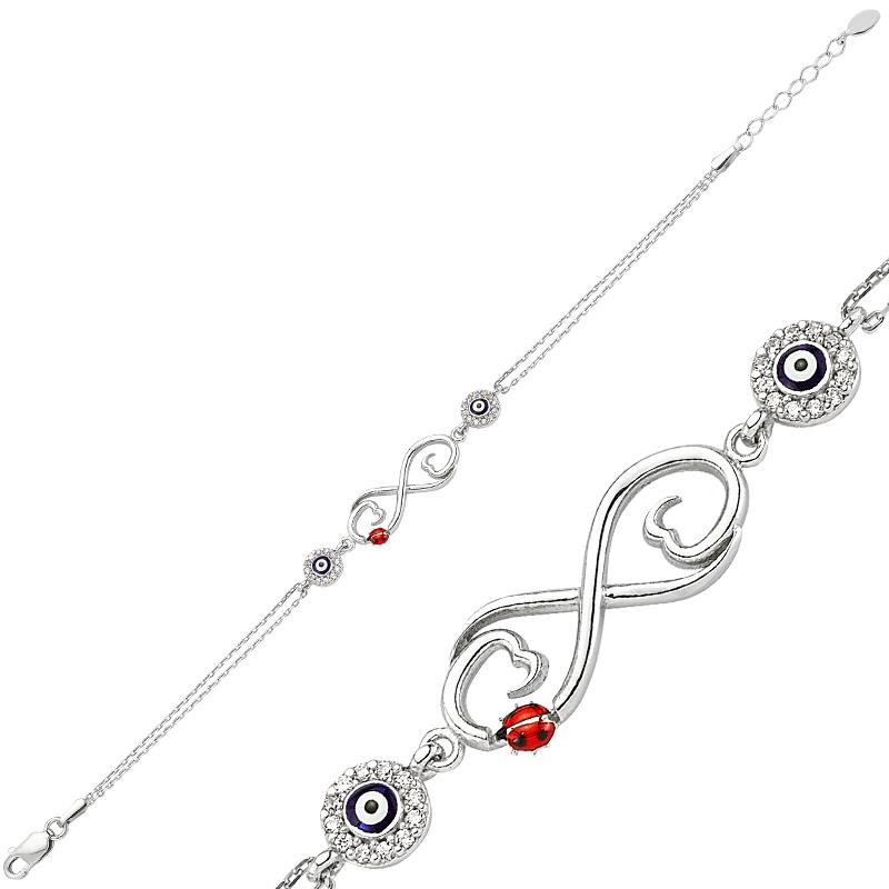 Silver Evil-Eye Infinity Women's BraceletOne of the most beautiful and meaningful ways to express your eternal love to your loved ones is with this evil-eye bead infinity bracelet. With this special silver bracelet, you can express your eternal love to your loved ones and send the message that you will be together forever. Made of 925 sterling silver. Rhodium-plated silver. Rhodium-plated women's silver bracelets preserve their shine for a long time and delay oxidation. All of our bracelet models are handmade. Due to silver and precious stones, there may be a ±10% deviation from the average product weight.Average Weight: 3.50 gr.