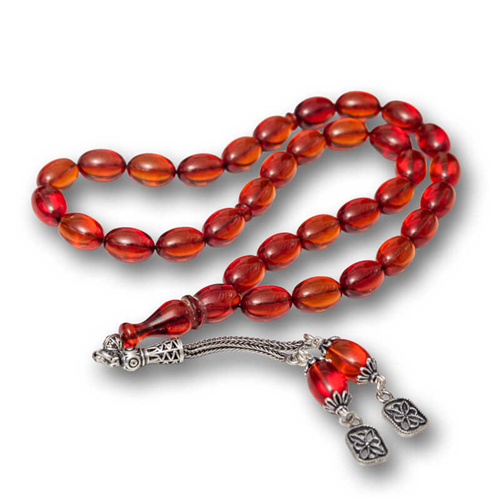 Fire Amber Prayer Beads with Silver Tassels The fire amber prayer beads with silver tassels are a traditional prayer beads that stand out with their elegant design and warm tones of natural stone. While silver tassels increase the elegance and durability of the prayer beads, the amber beads stand out with their natural beauty and relaxing energy. Fire amber is usually in bright orange and red colors and is a symbol of energy and vitality. This prayer beads can be found among the special gift options for your loved ones with both its usefulness and aesthetic appearance. The squeezed amber prayer beads model is completely handmade like other amber prayer beads models. Note: The silver tassel ends of the prayer beads are sent in different models. Bead Width: 0.80 cm Bead Length: 1.00 cm Prayer Length: 30 cm Average Weight: 26.00 gr