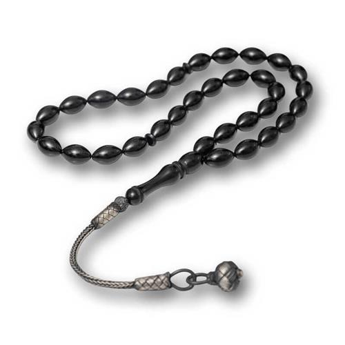 Gümüş Kazaz Püsküllü Siyah Sıkma Kehribar Tesbih