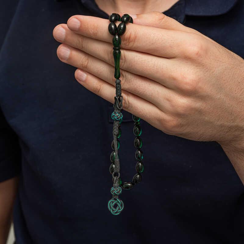 Gümüş Kazaz Püsküllü Yeşil Sıkma Kehribar Tesbih