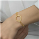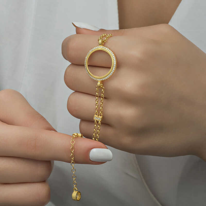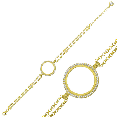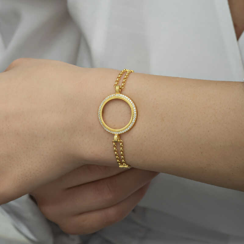 Gold Plated Women's Bracelet with Silver Quarter Rings Let your love come to life on the skin of the woman you love with the gold women's bracelet model that can be worn with a silver quarter ring, expressing elegance with its round form pattern. Adorn your loved one's wrist with love with this women's bracelet model that young lovers and those who feel young can choose on special occasions. This women's bracelet, which your loved ones will enjoy wearing as much as you, will be one of the best gifts for your loved one. This women's bracelet model is made of 925 sterling silver. Gold plated on silver. Gold plated silver women's bracelet models preserve their shine for a long time and oxidation is delayed. The white stones on the bracelet are zirconias. Like all women's bracelet models, the silver women's bracelet model is produced by hand. Due to silver and precious stones, there may be a ± 10% deviation in the average product weight. Width: 2.20 cm Length: 2.30 cm Chain Length: 23 cm Average Weight: 7.10 gr.