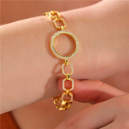 Gold Plated Women's Bracelet with Silver Quarter RingLet your love come to life on the skin of the woman you love with the gold women's bracelet model that can be worn with a silver quarter ring, expressing elegance with its round form pattern. Adorn your loved one's wrist with love with this women's bracelet model that young lovers and those who feel young can choose on special occasions. This women's bracelet, which your loved ones will enjoy wearing as much as you, will be one of the best gifts for your loved one. This women's bracelet model is made of 925 sterling silver. Gold plated on silver. Gold plated silver women's bracelet models preserve their shine for a long time and oxidation is delayed. The white stones on the bracelet are zirconias. Like all women's bracelet models, the silver women's bracelet model is produced by hand. Due to silver and precious stones, there may be a ± 10% deviation in the average product weight.Bracelet Diameter: 2.20 cmChain Length: 19 cmAverage Weight: 13.50 gr.
