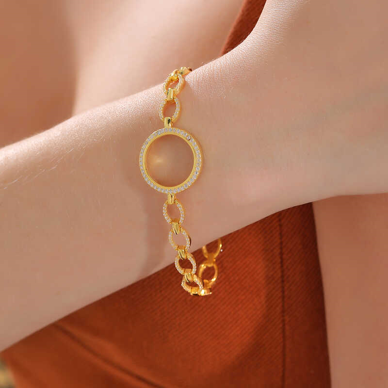 Gold Plated Women's Bracelet with Silver Quarter RingLet your love come to life on the skin of the woman you love with the gold women's bracelet model that can be worn with a silver quarter ring, expressing elegance with its round form pattern. Adorn your loved one's wrist with love with this women's bracelet model that young lovers and those who feel young can choose on special occasions. This women's bracelet, which your loved ones will enjoy wearing as much as you, will be one of the best gifts for your loved one. This women's bracelet model is made of 925 sterling silver. Gold plated on silver. Gold plated silver women's bracelet models preserve their shine for a long time and oxidation is delayed. The white stones on the bracelet are zirconias. Like all women's bracelet models, the silver women's bracelet model is produced by hand. Due to silver and precious stones, there may be a ± 10% deviation in the average product weight.Bracelet Diameter: 2.20 cmChain Length: 19 cmAverage Weight: 11.50 gr.