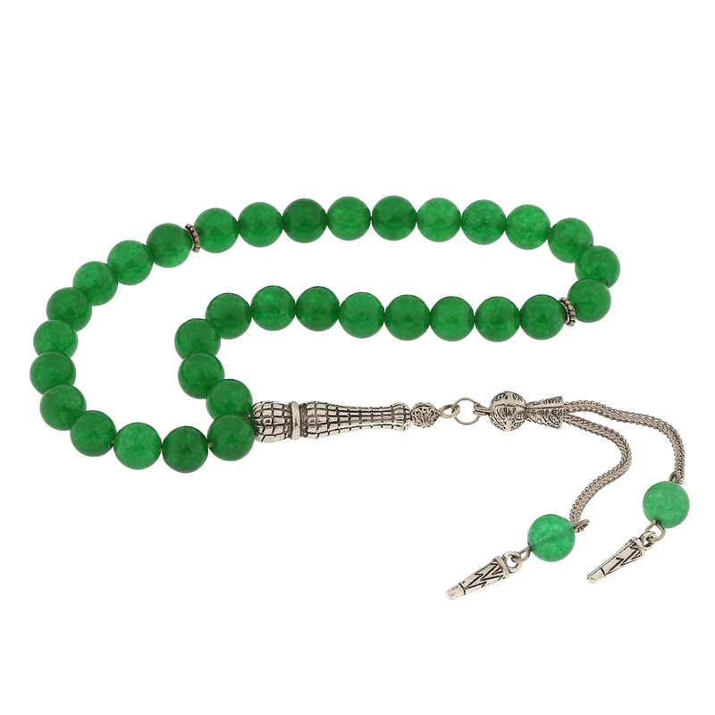 Green Jade Prayer Beads with Metal Tassels Green Jade: This is the most common stone. It is very calming to the nervous system. The color green represents life and growth. It facilitates constructive expressions of love by helping to cultivate passions. It is considered the most revered stone of honor in Asian countries. Jade is known to be very beneficial for the heart, immune system, spleen, kidneys, nervous system, thymus, and hair. The prayer beads are handmade. Due to the silver and precious stones, the indicated weight may vary by ±10%. Length: 25.00 cm, Grain Size: 0.80 cm, Average Weight: 32 g
