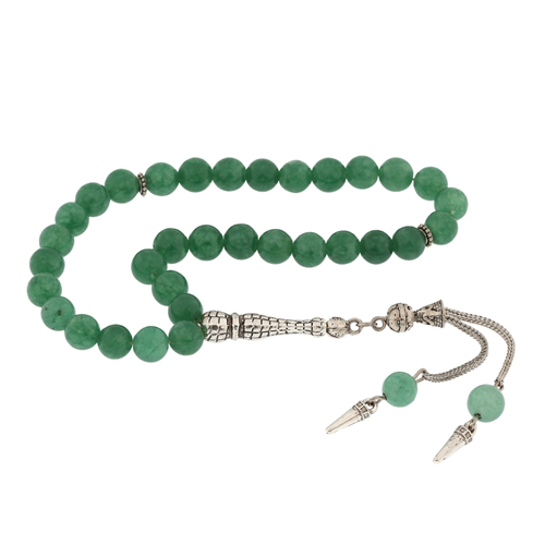 Green Jade Prayer Beads with Metal Tassels Green Jade: This is the most common stone. It is very calming to the nervous system. The color green represents life and growth. It facilitates expressions of love by helping to cultivate passions in a constructive way. It is considered the most revered stone of honor in Asian countries. Jade is known to be very beneficial for the heart, immune system, spleen, kidneys, nervous system, thymus, and hair. The prayer beads are handmade. Due to the silver and precious stones, the indicated weight may vary by ±10%. Length: 24.00 cm, Bead Size: 0.80 cm, Average Weight: 31 g