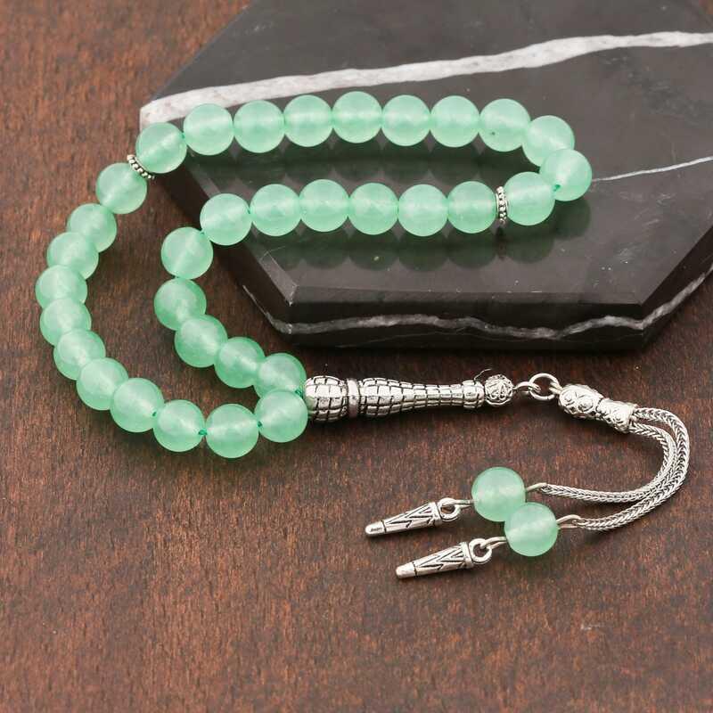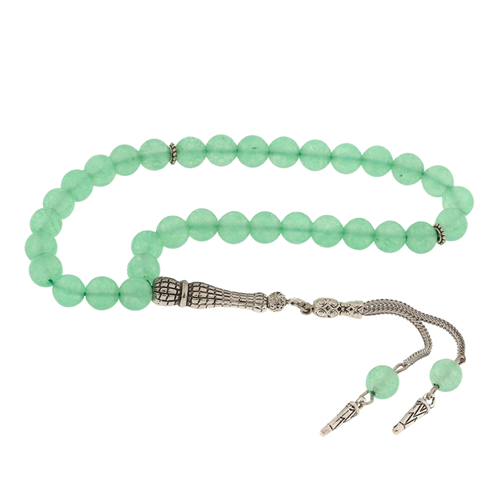 Jade Prayer Beads with Metal Tassels Jade traditionally symbolizes the five virtues of humanity: wisdom, justice, compassion, modesty, and courage. Therefore, it is used for emotional balance, endurance, love, loyalty, humility, generosity, peace, harmony, courage, wisdom, justice, and compassion. It is known as androgynous and therefore is considered to provide a gentle, lasting healing energy. Jade comes in different colors and can be used for each chakra, depending on its color. Jade is known to be very beneficial for the heart, immune system, spleen, kidneys, nervous system, thymus, and hair. The prayer beads are handmade. Due to the silver and precious stones, the indicated weight may vary by ±10%. Length: 25.00 cm Grain Size: 0.80 cm Average Weight: 33 g