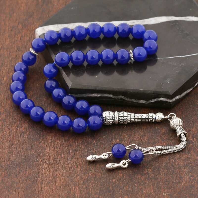 Natural Stone Blue Jade Prayer Beads with Metal Tassels Blue Jade: A peaceful and passive source of energy. Recommended for those who meditate to relax and gain inner peace. It encourages patience and slow, steady progress. It helps the wearer understand how to cope with situations beyond their control and those who feel limited. Jade is known to be very beneficial for the heart, immune system, spleen, kidneys, nervous system, thymus, and hair. The prayer beads are handmade. Due to the silver and precious stones, the stated weight may vary by ±10%. Length: 24.00 cm Bead Size: 0.80 cm Average Weight: 32 g