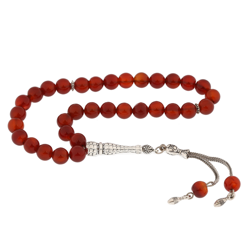 Natural Stone Burgundy Agate Prayer Beads with Metal Tassels The rich variety of agate stones means that there is infinite healing space within the physical, emotional, and spiritual elements of our being. Their balancing, grounding, and their ability to keep wearers open and willing to receive all the abundance the universe desires are just a few of the common characteristics of all agates. This precious stone is a perfect choice for birthday gifts, Father's Day, or special occasions. The prayer beads are handmade. Due to the silver and precious stones, there may be a ±10% deviation in the stated product weight. Length: 23.00 cm Bead Size: 0.70 cm Average Weight: 32.5 g