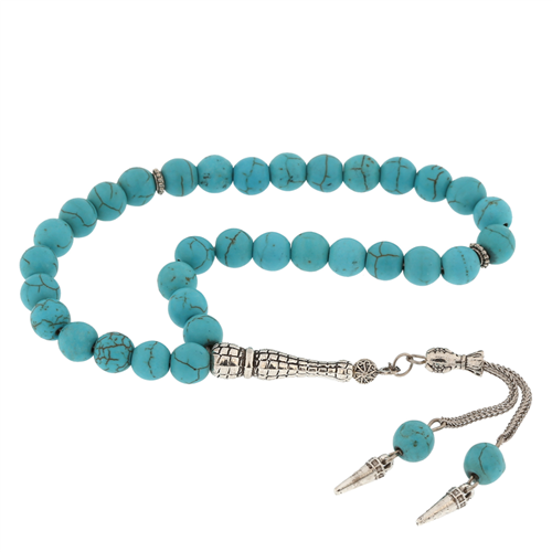 Natural Stone Metal Tasseled Turquoise Stone Prayer Beads Turquoise stone is a powerful and opaque stone of protection, as if carved from a deep blue heaven and brought to Earth. Its unique blue color is usually blue-green. This tranquil shade of color also gives it the name Turquoise. The delicate cream-colored veining and texture on it are inherent in the stone. For thousands of years, turquoise has been a symbol of wisdom, nobility, and immortality. Turquoise is a special stone that provides many benefits to all who love and wear it. It helps you feel at home while allowing your true voice to flow. It brings good luck, heals old wounds, and is a stone of life that affirms wealth into your world. The prayer beads are handcrafted. Due to the silver and precious stones, there may be a ±10% deviation in the stated product weight. Length: 24.00 cm Grain Size: 0.80 cm Average Weight: 28 gr