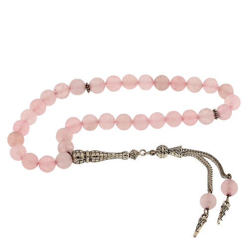 Natural Stone Metal Tasseled Pink Quartz Prayer Beads The pink quartz prayer beads eliminate negative energy surrounding a person and collect, activate, and accumulate positive energy. It also has the ability to activate thought forms. It is also possible to benefit and receive assistance from this stone in achieving inner peace and developing a more cheerful personality. This precious stone is a perfect choice for birthday gifts, Father's Day, or special occasions. The prayer beads are handmade. Due to the silver and precious stones, the stated product weight may vary by ±10%. Length: 25.00 cm Grain Size: 0.80 cm Average Weight: 35 g