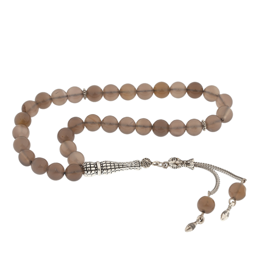 Natural Stone Water Agate Prayer Beads with Metal Tassels The rich variety of agate stones means that there is infinite healing space in the physical, emotional, and spiritual elements of our being. Being mostly balancing, providing grounding, and ready to keep the wearer open and willing to receive all the abundance the universe wants to send are just a few of the common characteristics of all agates. This precious stone is a perfect choice for a birthday gift, Father's Day, or any special occasion. The prayer beads are handmade. Due to silver and precious stones, there may be ± 10% deviation in the specified product weight. Length: 24.00 cm Grain Length: 0.80 cm Average Weight: 32.80 gr