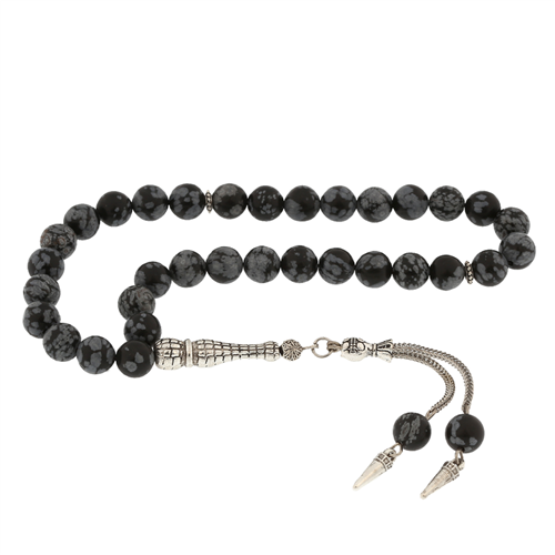 Obsidian Stone Prayer Beads with Metal Tassels Obsidian is a semi-precious stone, also known as a volcanic stone. It cleanses the body of negative energies, irregularly functioning chakras, and negativity accumulated in the aura. It cleanses the shadow self, flaws, weaknesses, and fears in the subconscious. It heals the soul and attracts positive energies. For this reason, it is called a protective stone. Obsidian is particularly beneficial for psychologically motivating a person. For this reason, it is widely used. Along with its many other benefits, it is among the world's most valuable stones. The prayer beads are handmade. Due to the silver and precious stones, the stated product weight may vary by ±10%. Length: 25.00 cm Grain Size: 0.80 cm Average Weight: 33 g