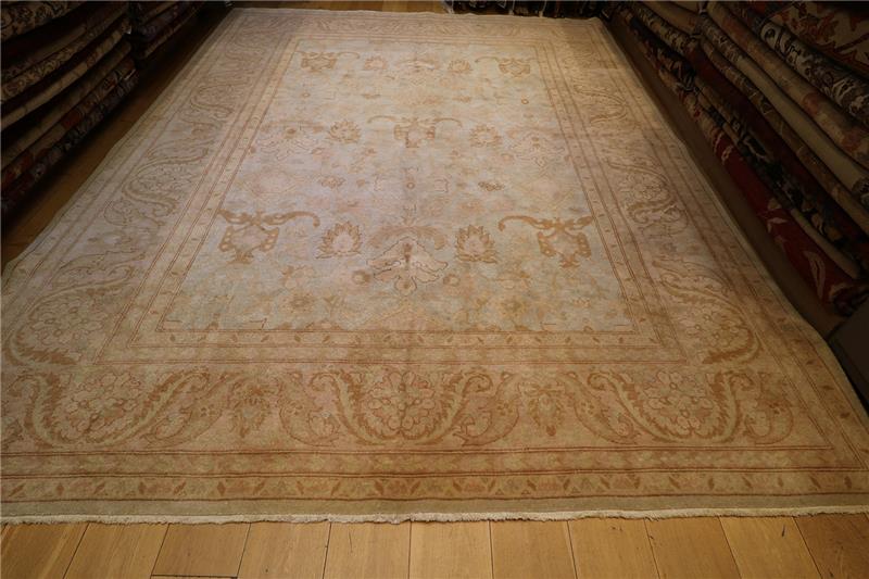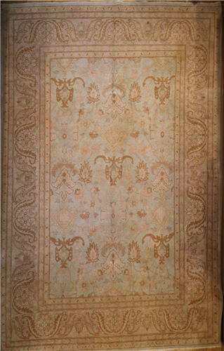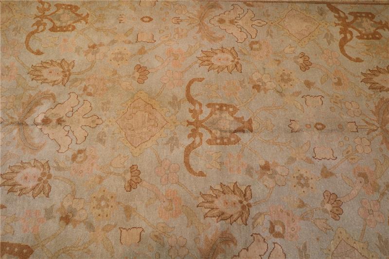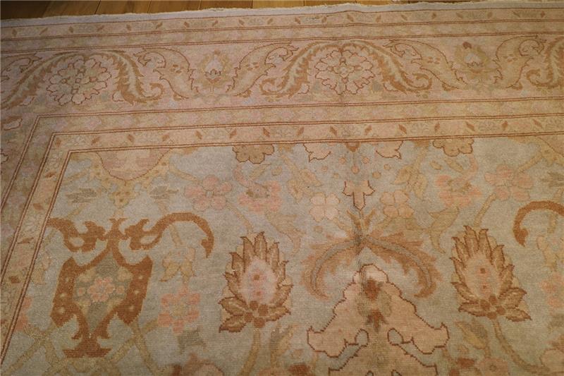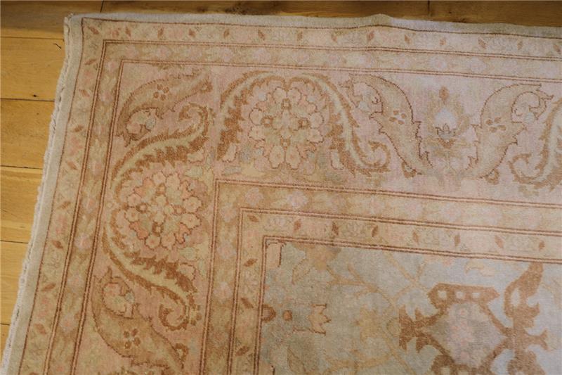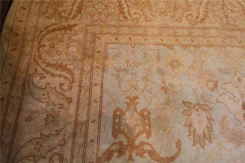 This particular rug is approximately 75 to 80 years old and very good condition. But There are very light stain spots in a dark tone on some parts of the Carpet.