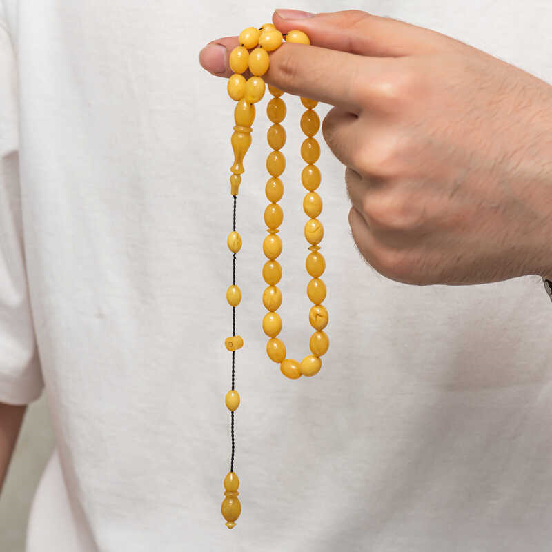 Pressed Amber Prayer Beads Amber is a substance formed by the accumulation of pine tree resin underground over many years. It is almost as hard as stone, but its density is lower. It emits a pine scent. Because its formation takes a long time and cannot be made artificially, it is a valuable substance. Pressed amber, however, is a material that shares its characteristics and resembles it in appearance, but is not real. Various materials have been produced from amber in our country and in many parts of the world. Prayer beads are the most commonly produced in our country. Amber prayer beads give off an amber-like scent and change color as they warm in the hand. They come in many colors. There are even amber prayer beads that are a combination of two colors. Our country's distinguished prayer beads masters frequently process this material to create various works of art. These prayer beads are bought and sold by collectors. The squeezed amber prayer beads model is a very elegant type of prayer beads that can be used in daily life. An indispensable gift for special occasions, squeezed amber prayer beads can be preferred as gifts for men on special occasions such as birthdays, Valentine's Day and Father's Day. The squeezed amber prayer beads model, like other amber prayer beads models, is entirely handmade. Bead Width: 0.80 cm Bead Length: 1.00 cm Prayer Length: 33 cm Average Weight: 18 g