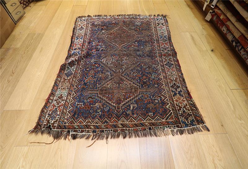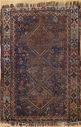 This rug is over a hundred years old and it is in generally good condition with little wear and some worn areas.