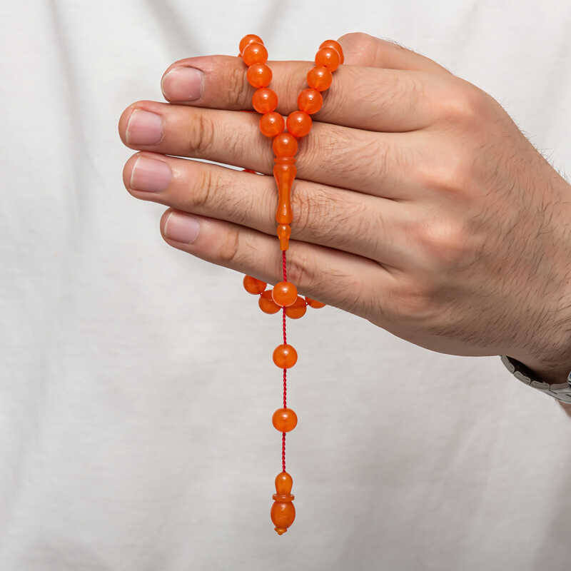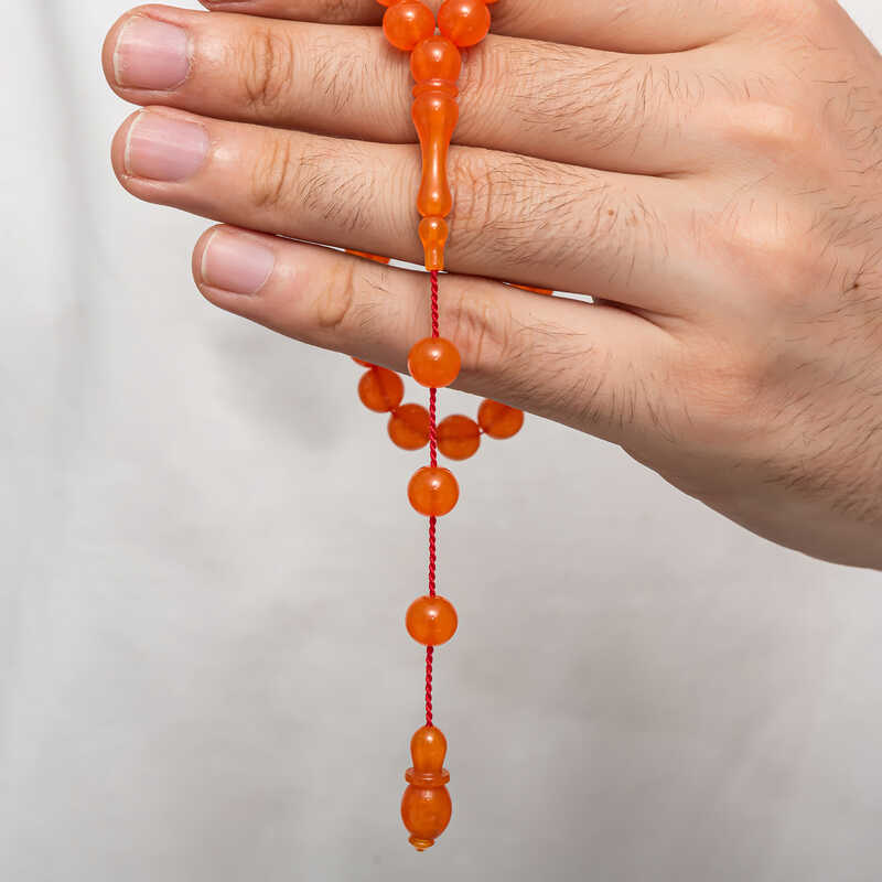 Round Pressed Amber Prayer Beads Amber is a substance formed by the accumulation of pine tree resin underground over many years. It is almost the same hardness as stone, but its density is lower. It emits a pine scent. It is a valuable substance because its formation takes a long time and cannot be made artificially. Pressed amber, however, is a material that shares its characteristics and resembles it in appearance, but is not real. Various materials have been produced from amber in our country and in many parts of the world. Prayer beads are the most commonly produced in our country. Amber prayer beads give off an amber-like scent and change color as they are heated in the hand. They come in many colors. There are even amber prayer beads that are a combination of two colors. Our country's distinguished prayer beads masters frequently process this material to create various works of art. These prayer beads are also bought and sold by collectors. The squeezed amber prayer beads are a very elegant type of prayer beads that can be used in daily life. An indispensable gift for special occasions, squeezed amber prayer beads are ideal as gifts for men on special occasions such as birthdays, Valentine's Day, and Father's Day. The squeezed amber prayer beads, like other amber prayer beads, are entirely handmade. Bead Width: 0.80 cm Bead Length: 0.80 cm Prayer Length: 25 cm Average Weight: 14 g