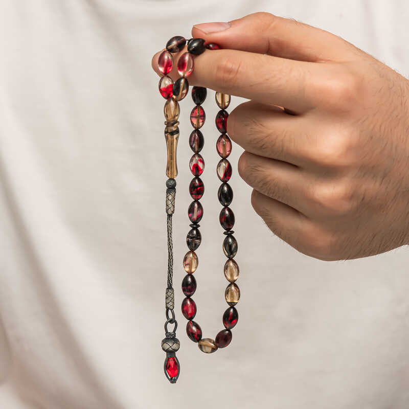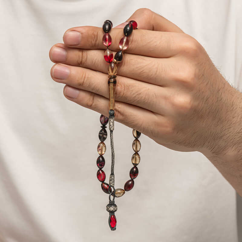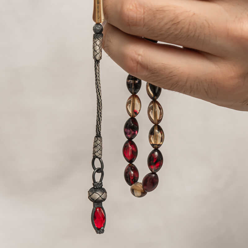 Silver 1000 Carat Kazaz Tassel Pressed Amber Prayer Beads Amber is a substance formed by the accumulation of pine tree resin underground over many years. It is almost the same hardness as stone, but its density is lower. It emits a pine scent. It is a valuable substance because its formation takes a long time and cannot be made artificially. Pressed amber, on the other hand, is a material that bears the characteristics of amber, resembles it in appearance but is not real. Various materials have been produced from amber in our country and in many parts of the world. Prayer beads are the most commonly produced in our country. Amber prayer beads give off an amber-like scent and change color as they are warmed in the hand. They come in many colors. There are even amber prayer beads that are a combination of two colors. They are usually used with a silver tassel or can be used systematically. Our country's distinguished rosary masters frequently craft this material to create various works of art. These rosaries are also bought and sold by collectors. The 1000-karat silver-plated amber rosary with a tassel is a very elegant rosary suitable for everyday use. A must-have gift for special occasions, these amber rosaries are a perfect gift for men on special occasions like birthdays, Valentine's Day, and Father's Day. The silver tasseled squeezed amber prayer beads model is manufactured entirely by hand, as are other amber prayer beads models. Bead Width: 0.80 cm Bead Length: 1 cm Prayer Length: 31 cm Average Weight: 17 gr