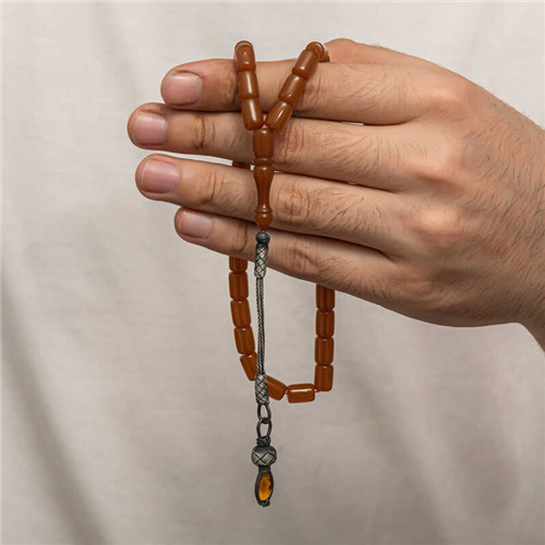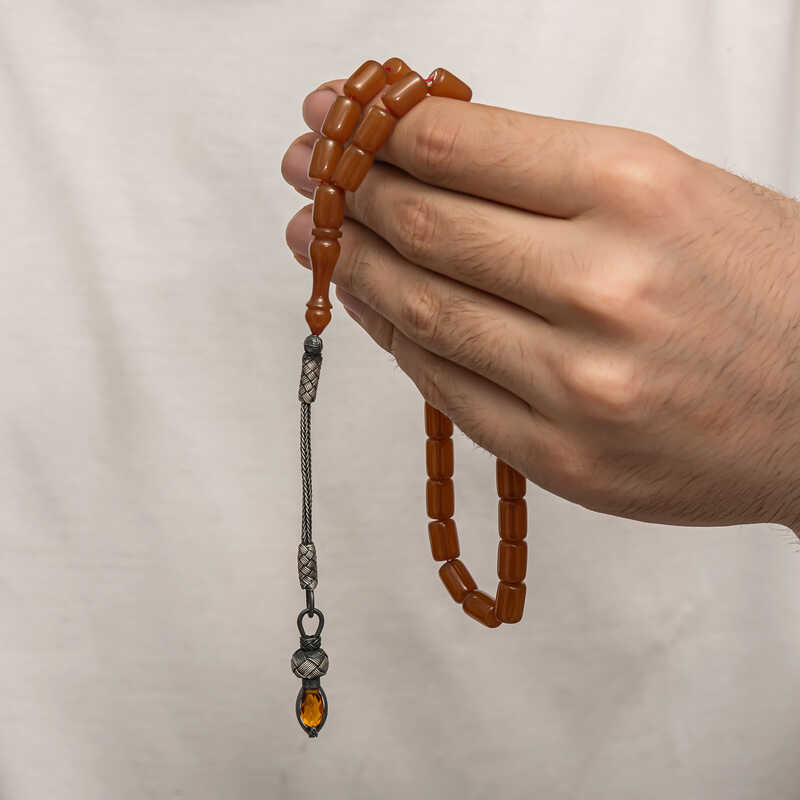 Silver 1000 Carat Kazaz Tassel Pressed Amber Prayer Beads Amber is a substance formed by the accumulation of pine tree resin underground over many years. It is almost the same hardness as stone, but its density is lower. It emits a pine scent. It is a valuable substance because its formation takes a long time and cannot be made artificially. Pressed amber, on the other hand, is a material that bears the characteristics of amber, resembles it in appearance but is not real. Various materials have been produced from amber in our country and in many parts of the world. Prayer beads are the most commonly produced in our country. Amber prayer beads give off an amber-like scent and change color as they are warmed in the hand. They come in many colors. There are even amber prayer beads that are a combination of two colors. They are usually used with a silver tassel or can be used systematically. Our country's distinguished rosary masters frequently craft this material to create various works of art. These rosaries are also bought and sold by collectors. The 1000-karat silver-plated amber rosary with a tassel is a very elegant rosary suitable for everyday use. A must-have gift for special occasions, these amber rosaries are a perfect gift for men on special occasions like birthdays, Valentine's Day, and Father's Day. The silver tasseled squeezed amber prayer beads model is manufactured entirely by hand, as are the other amber prayer beads models. Bead Width: 0.80 cm Bead Length: 1 cm Prayer Length: 30 cm Average Weight: 20 gr