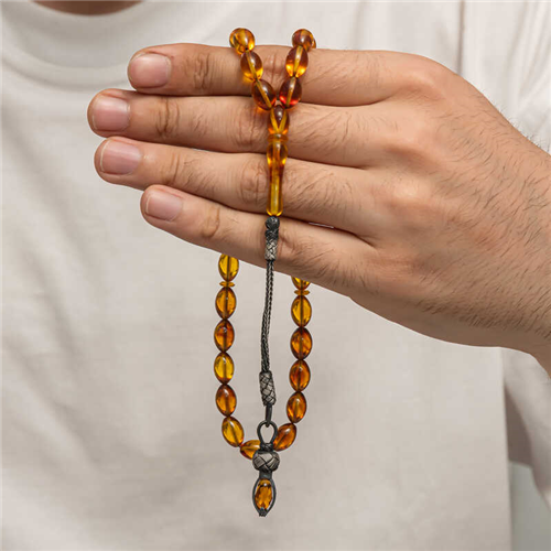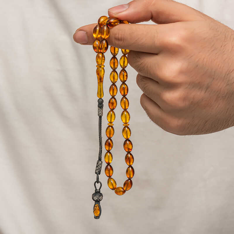 Silver 1000 Carat Kazaz Tassel Pressed Amber Prayer Beads Amber is a substance formed by the accumulation of pine tree resin underground over many years. It is almost the same hardness as stone, but its density is lower. It emits a pine scent. It is a valuable substance because its formation takes a long time and cannot be made artificially. Pressed amber, on the other hand, is a material that bears the characteristics of amber, resembles it in appearance but is not real. Various materials have been produced from amber in our country and in many parts of the world. Prayer beads are the most commonly produced in our country. Amber prayer beads give off an amber-like scent and change color as they are warmed in the hand. They come in many colors. There are even amber prayer beads that are a combination of two colors. They are usually used with a silver tassel or can be used systematically. Our country's distinguished rosary masters frequently craft this material to create various works of art. These rosaries are also bought and sold by collectors. The 1000-karat silver-plated amber rosary with a tassel is a very elegant rosary suitable for everyday use. A must-have gift for special occasions, these amber rosaries are a perfect gift for men on special occasions like birthdays, Valentine's Day, and Father's Day. The silver tasseled squeezed amber prayer beads model is manufactured entirely by hand, as are the other amber prayer beads models. Bead Width: 0.80 cm Bead Length: 1 cm Prayer Length: 30 cm Average Weight: 17 gr