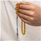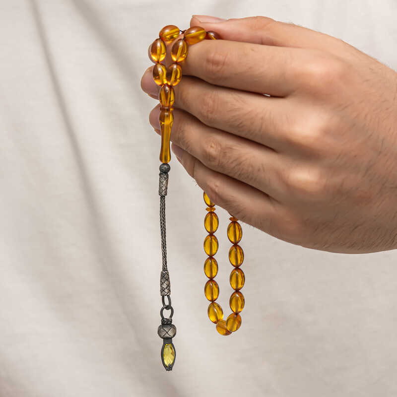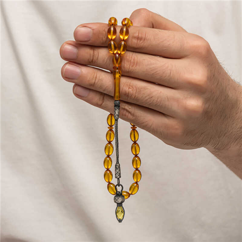Silver 1000 Carat Kazaz Tassel Pressed Amber Prayer Beads Amber is a substance formed by the accumulation of pine tree resin underground over many years. It is almost the same hardness as stone, but its density is lower. It emits a pine scent. It is a valuable substance because its formation takes a long time and cannot be made artificially. Pressed amber, on the other hand, is a material that bears the characteristics of amber, resembles it in appearance but is not real. Various materials have been produced from amber in our country and in many parts of the world. Prayer beads are the most commonly produced in our country. Amber prayer beads give off an amber-like scent and change color as they are warmed in the hand. They come in many colors. There are even amber prayer beads that are a combination of two colors. They are usually used with a silver tassel or can be used systematically. Our country's distinguished rosary masters frequently craft this material to create various works of art. These rosaries are also bought and sold by collectors. The 1000-karat silver-plated amber rosary with a tassel is a very elegant rosary suitable for everyday use. A must-have gift for special occasions, these amber rosaries are a perfect gift for men on special occasions like birthdays, Valentine's Day, and Father's Day. The amber rosary model with silver tassels is manufactured entirely by hand, as are other amber rosary models. Bead Width: 0.80 cm Bead Length: 1 cm Prayer Length: 30 cm Average Weight: 16 gr