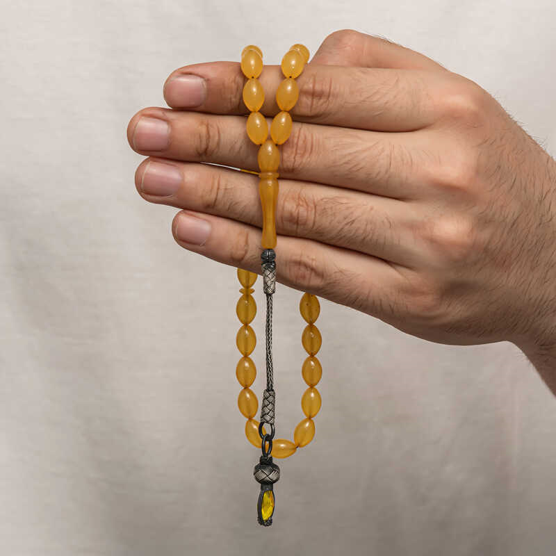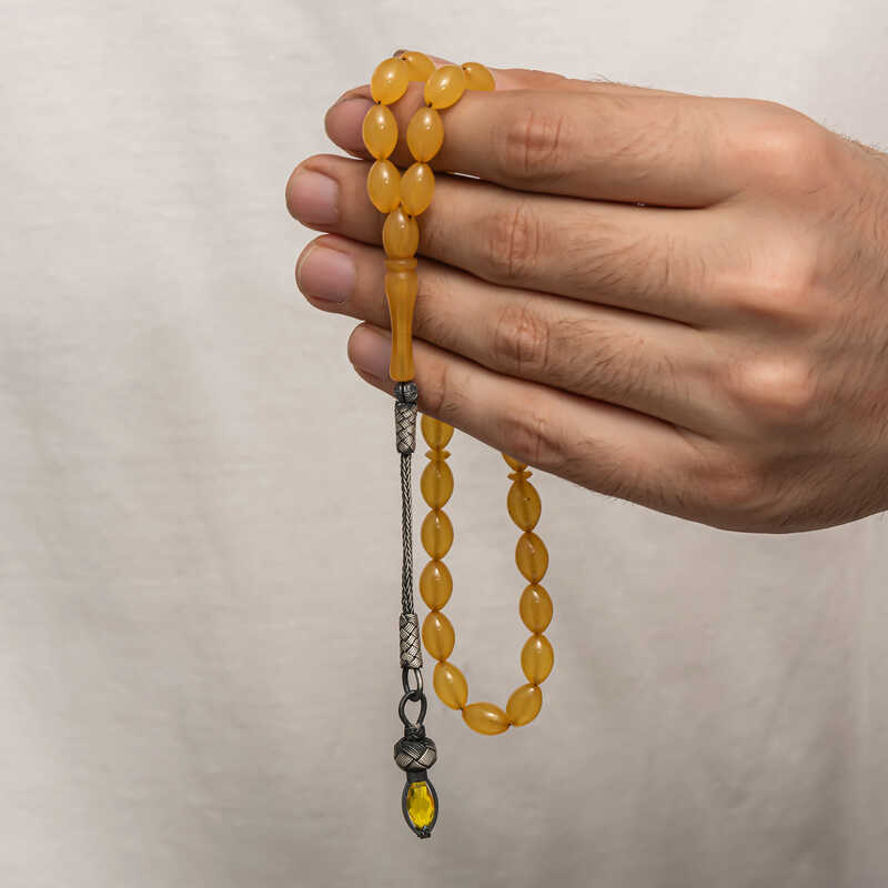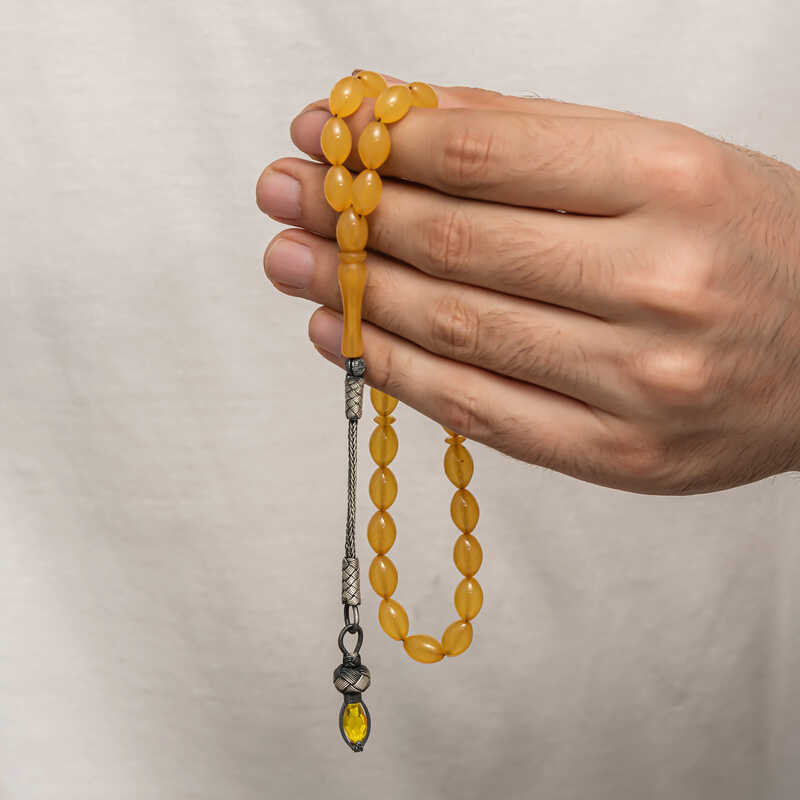Silver 1000 Carat Kazaz Tassel Pressed Amber Prayer Beads Amber is a substance formed by the accumulation of pine tree resin underground over many years. It is almost the same hardness as stone, but its density is lower. It emits a pine scent. It is a valuable substance because its formation takes a long time and cannot be made artificially. Pressed amber, on the other hand, is a material that bears the characteristics of amber, resembles it in appearance but is not real. Various materials have been produced from amber in our country and in many parts of the world. Prayer beads are the most commonly produced in our country. Amber prayer beads give off an amber-like scent and change color as they are warmed in the hand. They come in many colors. There are even amber prayer beads that are a combination of two colors. They are usually used with a silver tassel or can be used systematically. Our country's distinguished rosary masters frequently craft this material to create various works of art. These rosaries are also bought and sold by collectors. The 1000-karat silver-plated amber rosary with a tassel is a very elegant rosary suitable for everyday use. A must-have gift for special occasions, these amber rosaries are a perfect gift for men on special occasions like birthdays, Valentine's Day, and Father's Day. The amber rosary model with silver tassels is manufactured entirely by hand, as are other amber rosary models. Bead Width: 0.80 cm Bead Length: 1 cm Prayer Length: 30 cm Average Weight: 16 gr