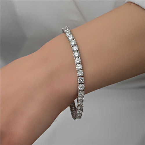 Silver 6 mm White Stone Waterway Women's Bracelet You will love using this bracelet, which resembles stars with its sparkling stones, in everyday life, special occasions and nights. The timeless white stone waterway silver bracelet is waiting for you, appealing to all women who want to achieve a stylish look. The silver white stone waterway women's bracelet is a perfect option for a birthday gift, Valentine's Day gift or as a gift for mothers on special occasions. The silver white stone waterway women's bracelet is made of 925 sterling silver. Rhodium plated on the silver. Rhodium plated women's bracelet preserves its shine for a long time and oxidation is delayed. Like all women's bracelets, the silver white stone waterway women's bracelet is produced by hand. Due to silver and precious stones, there may be a ± 10% deviation in the average product weight. Width: 0.60 mm Bracelet Length: 22 cm Average Weight: 25.40 gr.