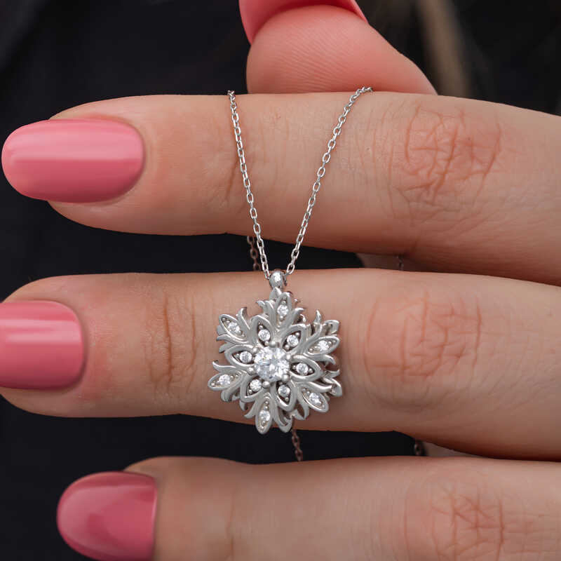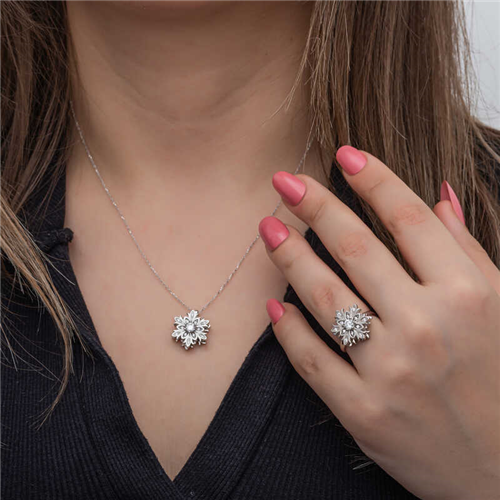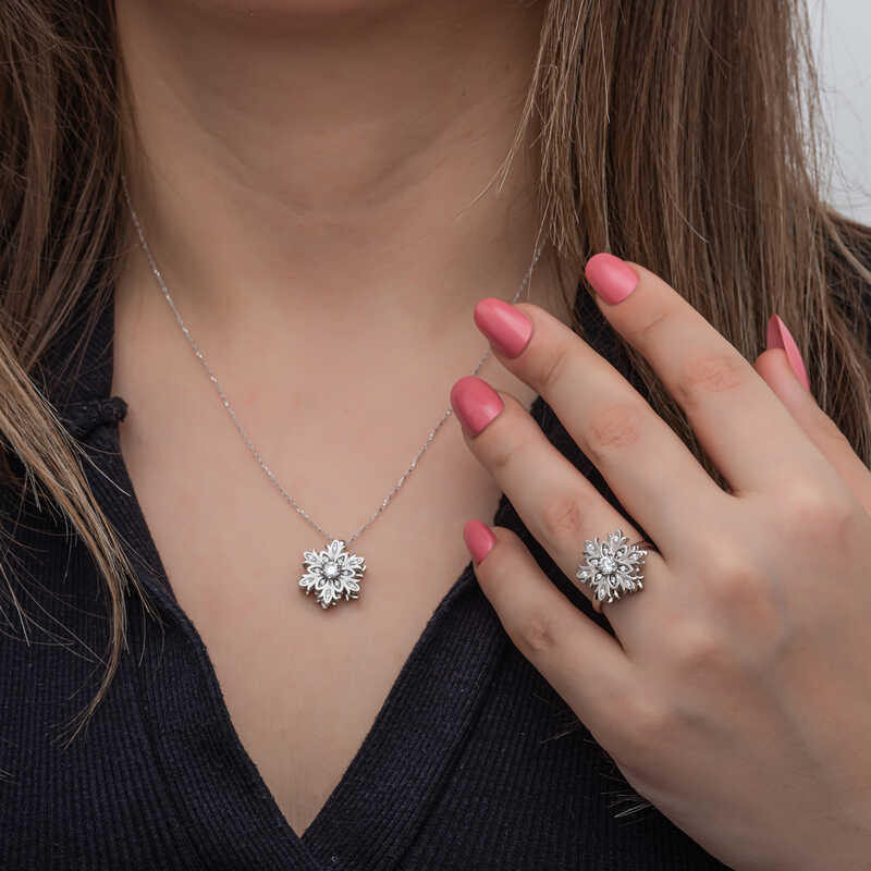 Silver Adjustable Snowflake Rotating Stress Women's Set The sparkle and clarity of women have been specially designed to resemble snowflakes. The fact that each snowflake, like women, is unique and has a different value is another feature that makes them special. Their nobility has managed to attract attention in every period. Additionally, it symbolizes that people, just like snowflakes, can live happily without hurting each other. This stylish set is a perfect option for a birthday gift, Valentine's Day gift or a gift for mothers on special occasions. The set is made of 925 sterling silver. Rhodium plated on the silver. Rhodium plated silver women's set models preserve their shine for a long time and oxidation is delayed. Like all silver women's set models, this silver adjustable snowflake rotating stress women's set is also entirely handmade. Due to silver and precious stones, there may be ± 10% deviation from the average product weight. Necklace Diameter: 1.70 cm Chain Length: 45 cm Avg. weight: 4.20 gr Ring Diameter: 1.70 cm Ring Length: 2.40 cm Avg. weight: 4.20 gr Total Weight: 8.40 gr