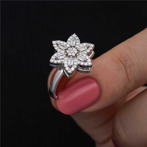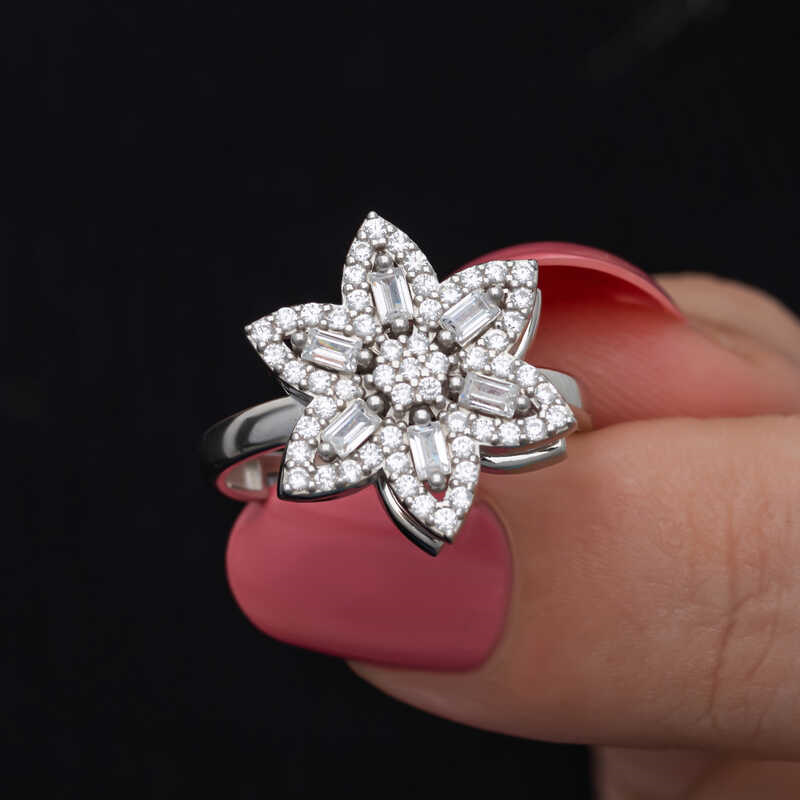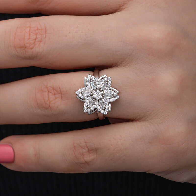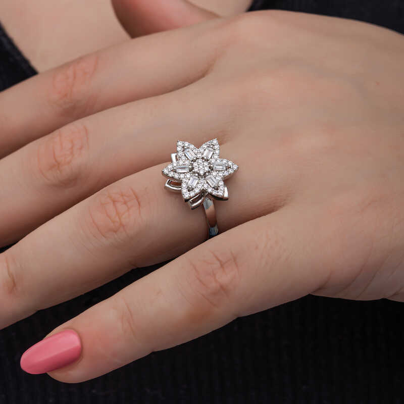 Silver Adjustable Star Baguette Stone Rotating Stress Women's Ring The star is an auspicious symbol believed to bring luck in many societies and teachings. It carries the energy of the Planet Venus. The Planet Venus is also the representative of the energy of love and romance. This stylish star ring made of baguette and zircon stones is a perfect option for a birthday gift, Valentine's Day gift or for special occasions. Silver rhodium star baguette stone adjustable rotating stress women's ring is made of 925 sterling silver. This ring is rhodium plated. Rhodium plated silver women's ring models preserve their shine for a long time. As with all our silver women's ring models, the silver rhodium adjustable star baguette stone stress rotating women's ring model is also handmade. Due to silver and precious stones, there may be ± 10% deviation in the average product weight. Star Ring Diameter: 1.60 cm Ring Length: 2.40 cm Average Weight: 3.50 gr.