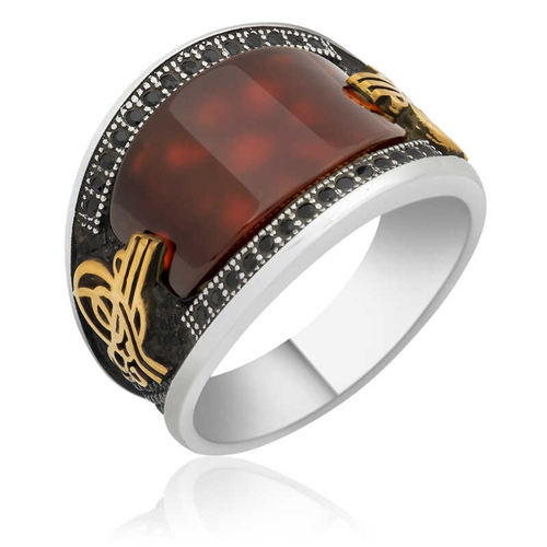 Silver Agate and Zircon Stone Tughra Crest Ring Tughra means the signature of the Ottoman sultans. Each tugra expresses the name, existence, and reign of the sultan it belongs to. The tugra symbol has survived to the present day in many forms, different for each sultan. The tugra was preserved in every period of the Ottoman Empire and never lost its importance. And over time, it has an important place in our calligraphy, and is kept alive artistically by calligraphers today. You can enjoy using this silver ring that reflects this art and gift it to your loved ones. Men's tughra ring is made of 925 sterling silver. The tughra ring is oxidized on silver. The stones on the ring are zircon and agate. Like all silver men's rings, the silver agate stone tughra men's ring model is produced entirely by hand. Due to silver and precious stones, there may be a ± 10% deviation in the average product weight. Width: 1.60 Average Weight: 9.50 gr.