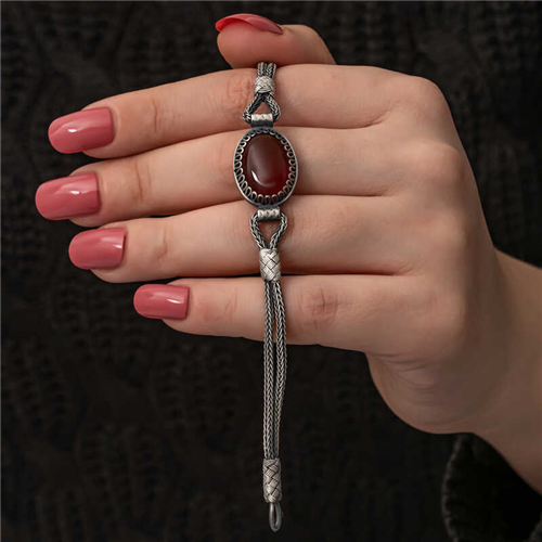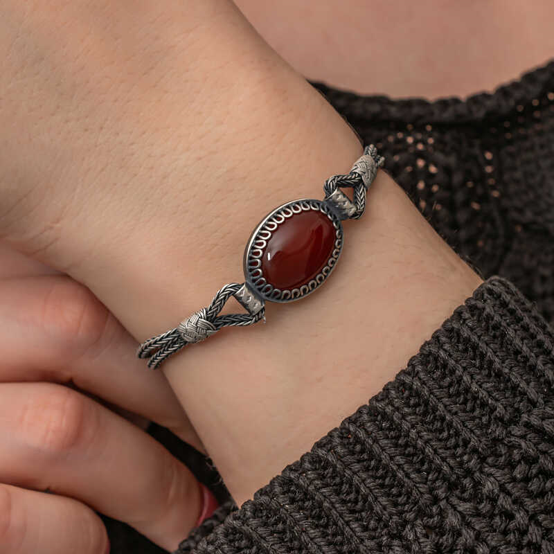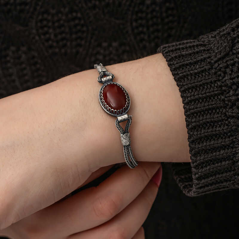 Silver Agate Stone Kazaziye BraceletKazaziye, kazazlık or kazaz; is a handicraft made from pure silver wires using knitting techniques. It is used in prayer beads and can also be made as a bracelet or necklace. The Kazaziye bracelet is completely handmade. The agate stone Kazaziye bracelet, which will never go out of style and appeals to those who want to achieve a stylish look, is waiting for you. The silver agate stone Kazaziye bracelet is a perfect option for a birthday gift, Valentine's Day gift or for special occasions. The silver bracelet is 1000 carat pure silver and is 100% handcrafted. Due to silver and precious stones, there may be a ± 10% deviation in the average product weight.Width: 1.10 cmBracelet Length: 18 cmAverage Weight: 10.20 gr.