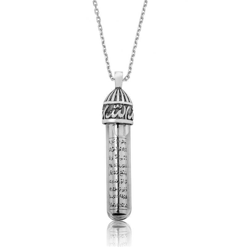 Silver Allah Cevşen Prayer Necklace The cevşen necklace, which is a spiritual armor for people, can be chosen as a birthday gift, Valentine's Day gift or a gift for mothers on special occasions. The cevşen prayer women's necklace model is made of 925 sterling silver. Oxidized silver is coated. Oxidized silver necklaces preserve their shine for a long time and oxidation is delayed. Like all necklaces, this silver cevşen prayer necklace is also produced entirely by hand. Due to silver and precious stones, there may be a ± 10% deviation from the average product weight. Necklace Width: 0.60 cm Necklace Length: 4.80 cm Chain Length: 45 cm Average Weight: 8.00 gr.
