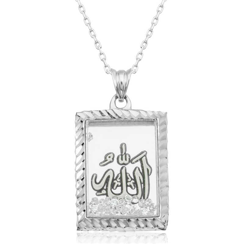 Silver Allah Written Women's Necklace Complete your eye-catching elegance with our necklace with Allah written on it, the first of 99 beautiful names. This beautiful necklace model is made of 925 sterling silver. Rhodium plated on the silver. Our rhodium-plated silver women's necklace models preserve their shine for a long time and oxidation is delayed. The average chain length of this Allah written necklace is 45 cm. As with all our women's necklace models, the Allah written silver women's necklace is handmade and there may be ± 10% deviation in product weight due to precious stones. Width: 1.60 cm. Length: 2.80 cm. Average Weight: 4.80 gr.